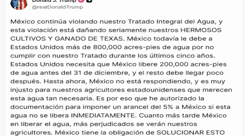 El presidente de Estados Unidos, Donald Trump, señaló que México violó el Tratado de Aguas, por lo que exige que se le libere agua antes del 31 de diciembre y en caso de seguir sin pagar, impondrá una tarifa del 5% de aranceles contra México por causar afectaciones a los cultivos y ganado de Texas.